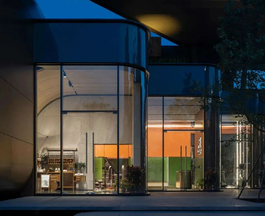 沿街入口界面打造传统生活情怀的主题橱窗,构筑城市友好界面。建筑立面采用"铜韵流体"创新设计,将装配式技术体系与美学表达深度融合,通过香槟金铝板与弧形LOW-E玻璃的精密组合工艺,形成兼具70年耐候性能与艺术表现力的标志性外立面体系。