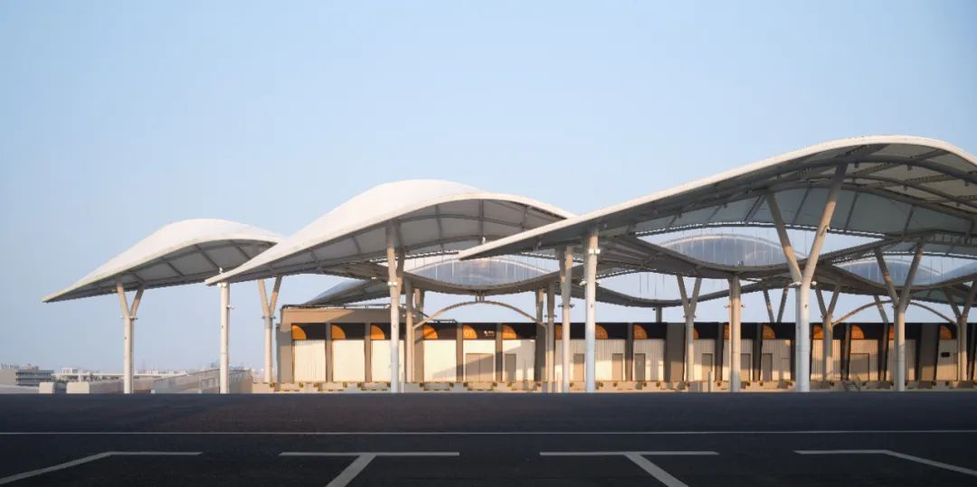 设计深度回应热带海岛气候特征,将遮阴避雨功能与在地文化转译融合:首层延续海口骑楼街廊的空间风格,通过连续拱廊形成光影交织的物流通道;二层轻盈的膜结构顶棚以海口市花三角梅形态为原型,纯白曲面既遮蔽烈日暴雨,又以海浪般的柔美曲线重塑口岸建筑表情。