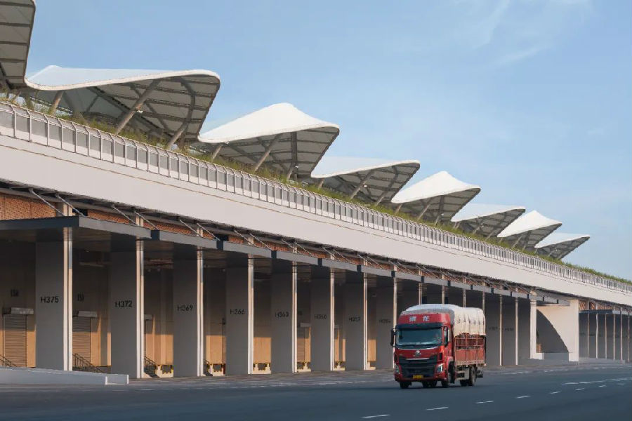 设计团队针对货运场景特性重构空间逻辑:不同于客运口岸的行人尺度,项目通过超尺度货运流线设计和持续优化,高效保障货车和货物的单向快速通行与查验。