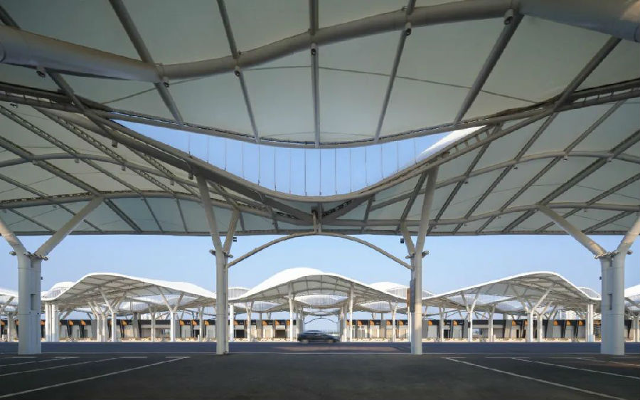 结构体系呈现"上轻下重"的智慧平衡:底层厚重拱廊承担主要荷载,顶部张拉膜展现技术轻盈感,二者通过抗震支座柔性连接。针对超大超长超高尺度建筑空间挑战,创新采用"分区消防+虹吸排水"复合系统,应对极端天气排水和板下消防难题,确保极端情况下的疏散安全。
