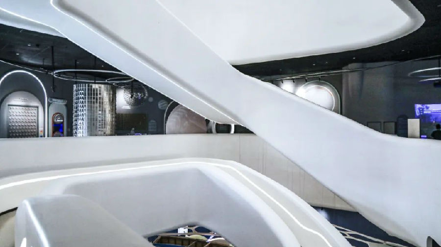 在科技馆流线型外观与内部几何解构空间共存背后,是超复杂结构体系的支撑。整体建筑形态相当复杂,包含大量倾斜、悬挑、扭转及下挂的结构柱。华阳作为施工图设计方,除了需要完成常规意义上的建筑深化设计,还需要在结构、材料、构造,以及设计方法和设计工具等层面引入诸多创新技术支撑。我们在结构上摆脱传统的二维平面设计方式,通过三维模型数字化手段精确模拟建筑结构的受力情况,使超限空间形态与建构逻辑达成和谐共生。我们创新地采用核心筒为整体支撑,巧妙地将整个大屋顶转化为悬挑31.5m高、最大跨度75m的钢桁架体系,在U字开口处形成超大跃层中庭。
