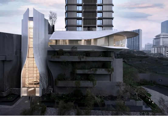 一是建筑的物化影响。非凡是建筑的物象,建筑本身是大体量的空间与立体构造,物化影响直观而高效。当我们在设计中塑造强烈的形式感,呈现第一眼的“非凡”印象,可以迅速建立影响力。比如港置·观宸的展示中心,以30米的巨大高差作为设计出发点,排布各个功能空间,加上蜂窝铝板与塑石等材料应用,以未来的表现方式形成视觉冲击。