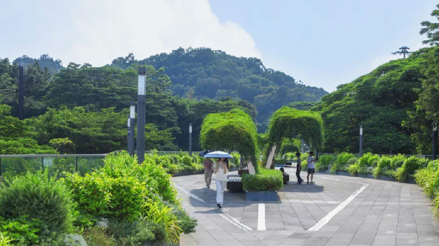 深业上城南区,通过“城市缝合”的设计策略,利用商业街区与空中连廊系统,不仅重建莲花山与笔架山之间的联系,也整合了商业、办公、文化功能,成为片区级的空间纽带。
