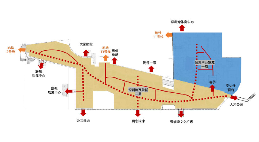 “地面-空中-地下”三维立体慢行系统,无缝串联深圳湾万象城、深圳湾文化广场、人才公园等整个后海CBD片区。
