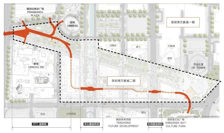 在空中,二层慢行连廊长达2公里,作为贯通全区的步行主轴,补齐了深圳湾大街的最后一环。