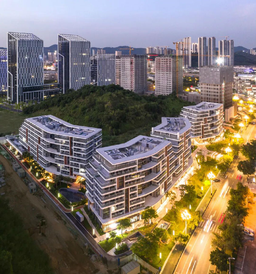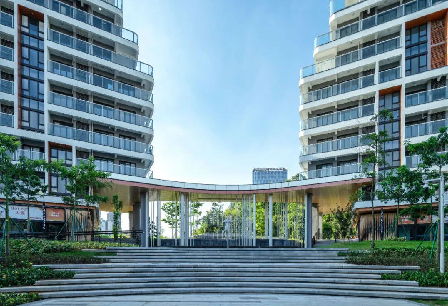 区别于当下密集的超高层住宅,项目以多层组团回应地形,以立体绿化、共享空间与装配化技术,让建筑在山体间生长出层次与温度。华阳国际从规划到建筑、景观、室内全程参与,实现小巧精致而富有呼吸感的生活场景。