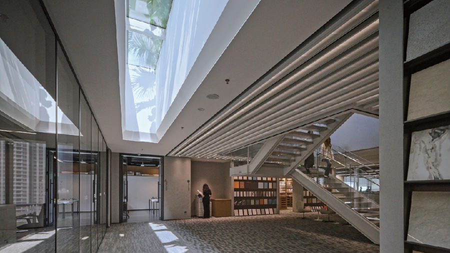在此设计团队分享了对光与空间的思考,光是连结室内与室外的无声语言。内外之间没有厚重的边界,只有流动的空气与视野。每个室内细节都与建筑外部相呼应,形成整体体验,让办公空间既专业又舒展。